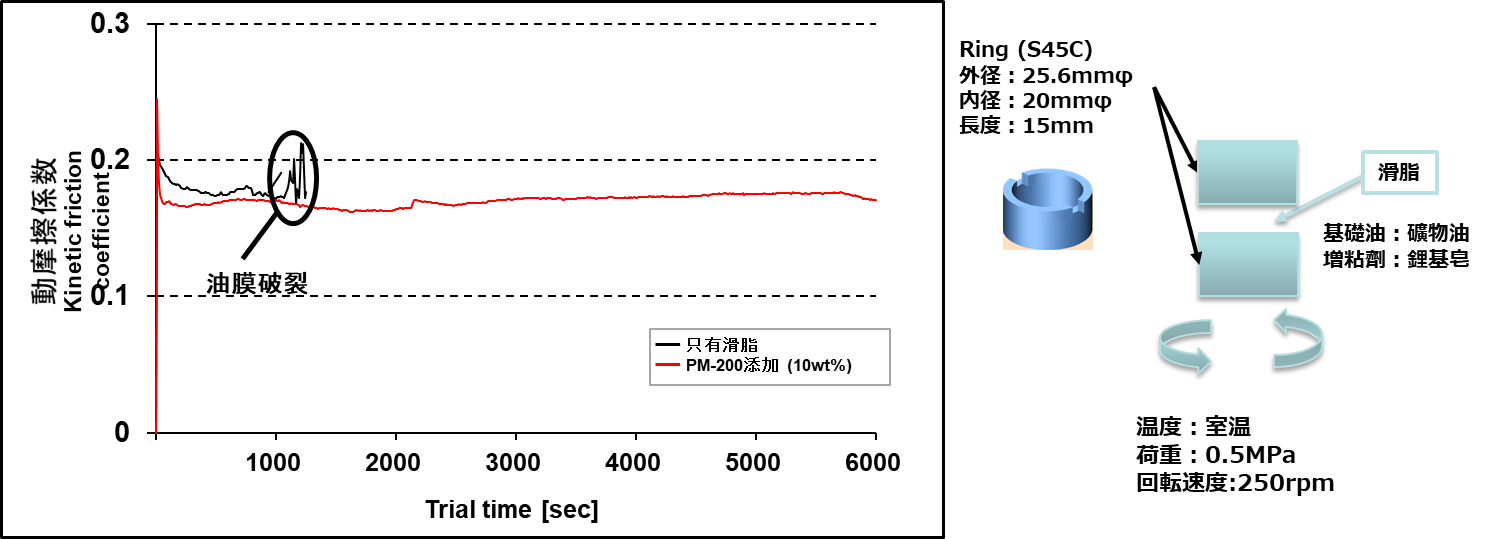 可應用於靜音齒輪或是他材滑動件的降噪改質。 - 靜音(降噪):於滑脂、塗料表層分布均勻,滑動時對速度依存性低,擁有絕佳靜音(降噪)效果。