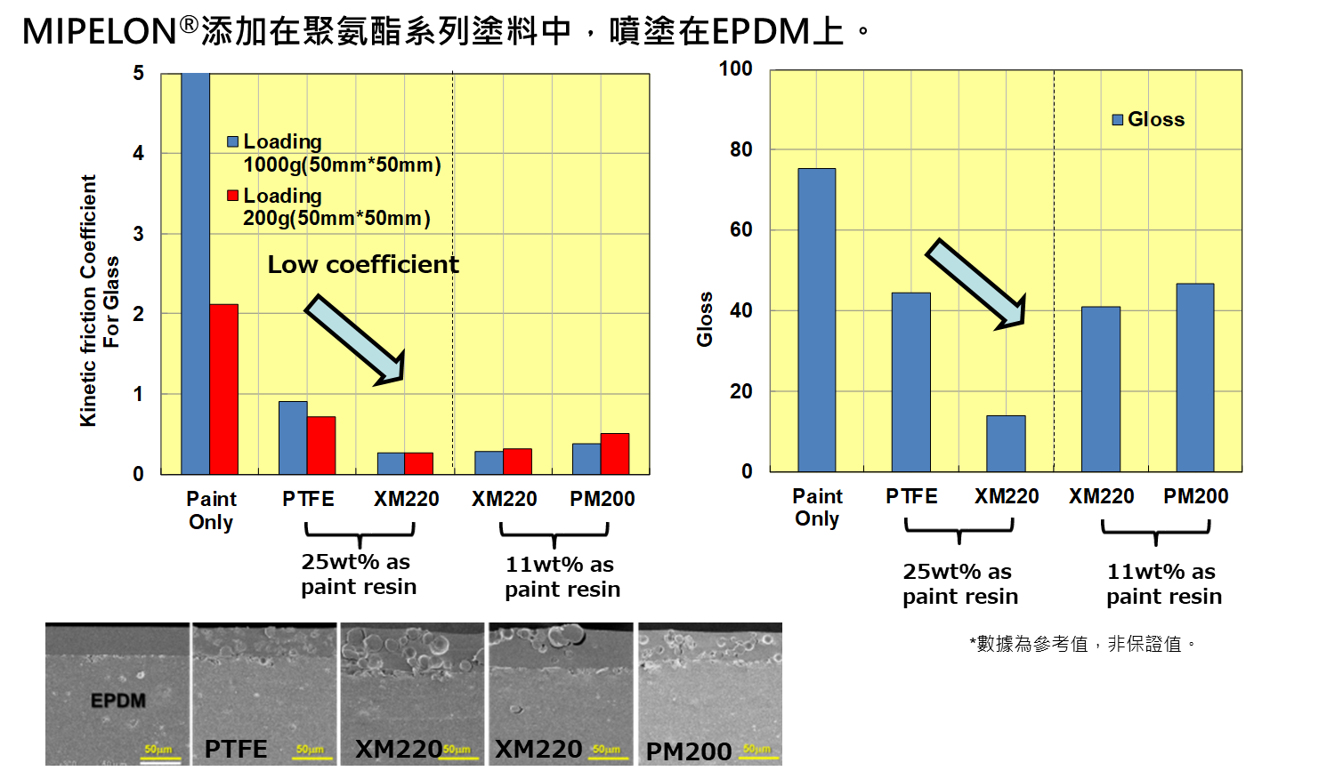 - 添加量只要PTFE一半即達到相同低摩擦係數效果