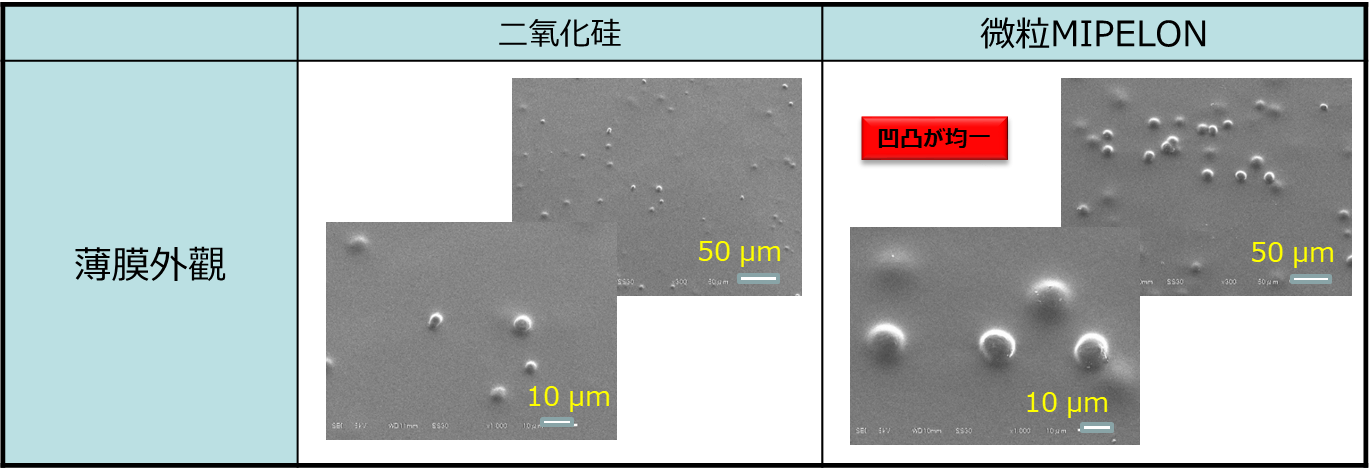 含有微粒MIPELON(PM-200)的薄膜凹凸均勻,其抗脫落性能高於含有二氧化硅的薄膜。此外,與二氧化硅相比,更少的添加量即可達到相同的效果。