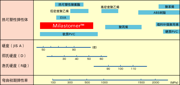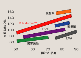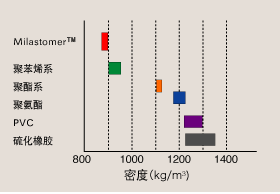 MILASTOMER™硬度範圍分佈廣泛,且與其他的軟質樹脂相比其密度更低。因其輕巧的特點,在汽車配件等領域有著廣泛的應用,是一種可以降低燃油費用值得期待的產品。