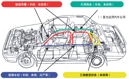 玻璃導槽、內飾表皮材料、擋泥板、各種密封件、各種把手、建材及土木用材料、體育用品