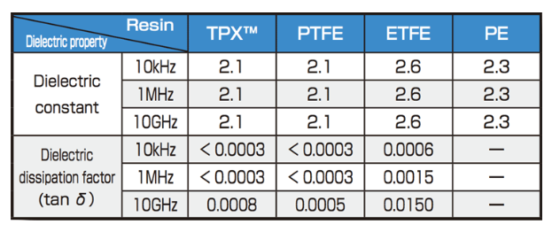 因其非極性結構,故有與PTFE不相上下的低介電特性(10GHz,e=2.1)。介電特性受頻率的影響小。