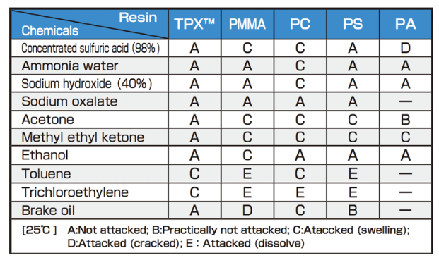 由於其穩定的C-C鍵,所以有比PC和壓克力更好的耐化性。對酸鹼類、酒精等也有更出色的耐久性。