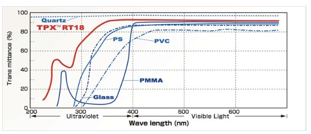 TPXTM雖為結晶性樹脂但具有可媲美玻璃、壓克力與PC塑料之高透明度。穿透率達90%,Haze<5%。