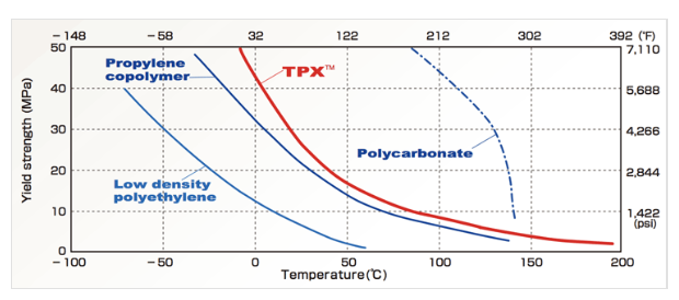TPXTM熔點約為220~240 ℃、維卡軟化點(VST)約145~170 ℃,是一款可耐高溫的透明結晶性塑料。