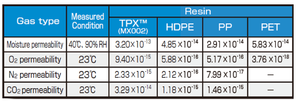 - 氣體通透性:TPXTM具有為數眾多且結構鬆散的側鏈,分子填充密度低,故具有良好的氣體透過性。