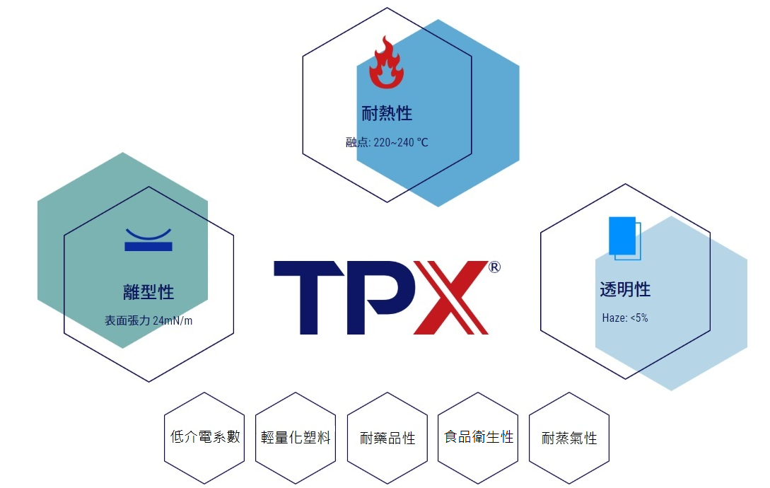 TPXTM屬聚烯烴類樹脂,透過三井化學獨有之樹脂聚合技術,由丙烯與Comonomer共聚而成,化學式名稱為Polymethylpentene (PMP)。