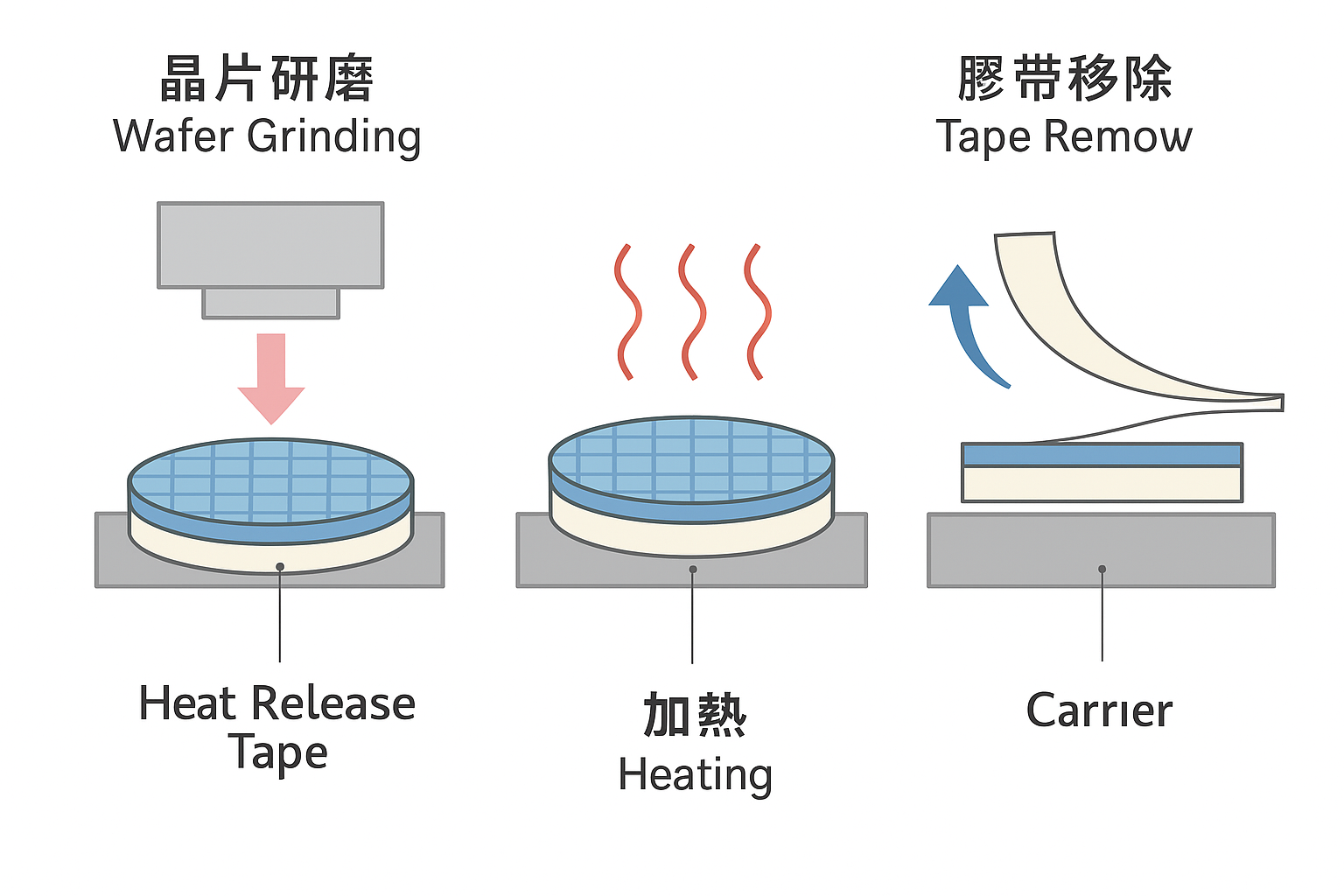 晶圓貼附於熱解離膠帶上,膠帶下方為承載載體(Carrier),上方進行研磨作業。