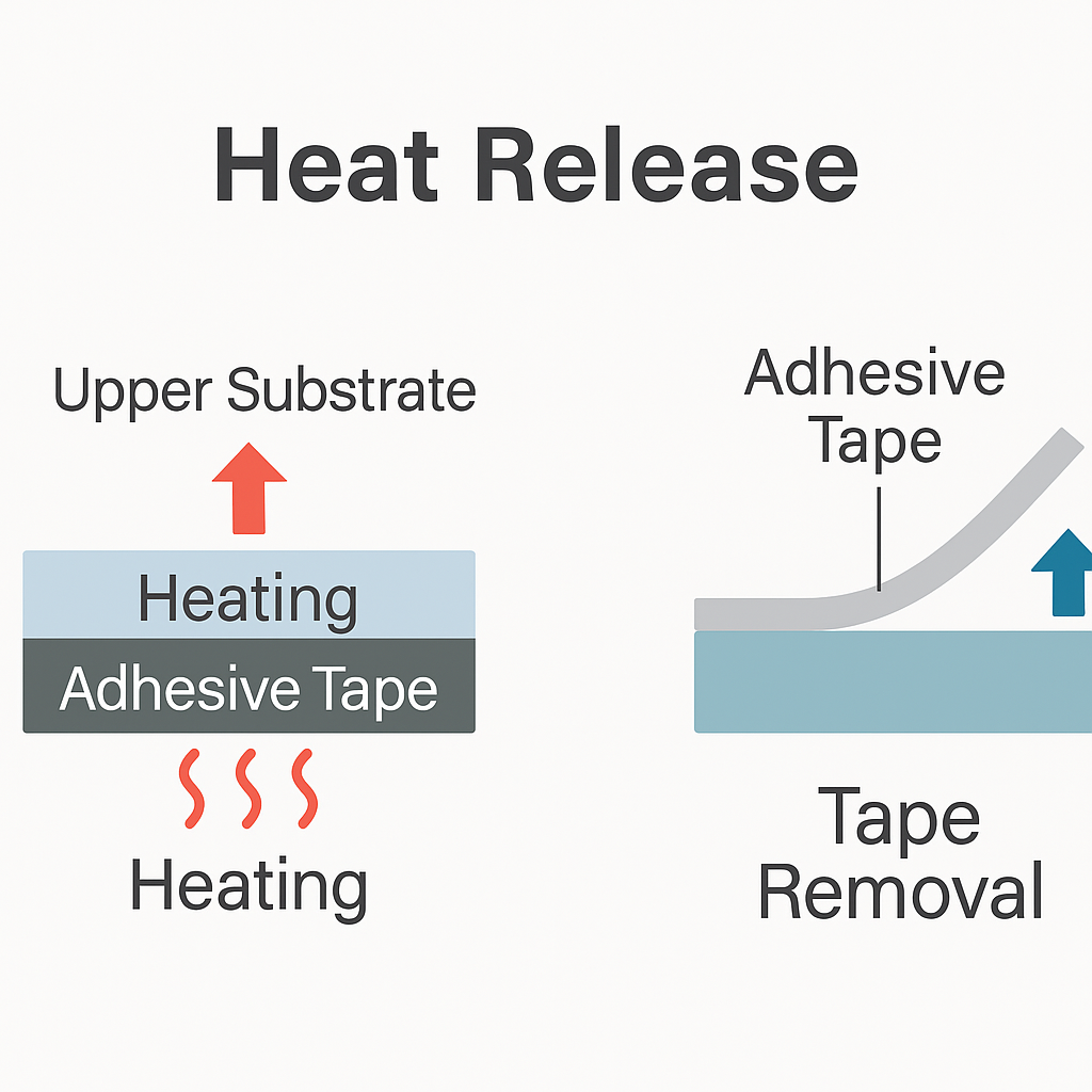 膠帶於設定溫度(常見為120°C~150°C)時失去黏性,實現快速分離。