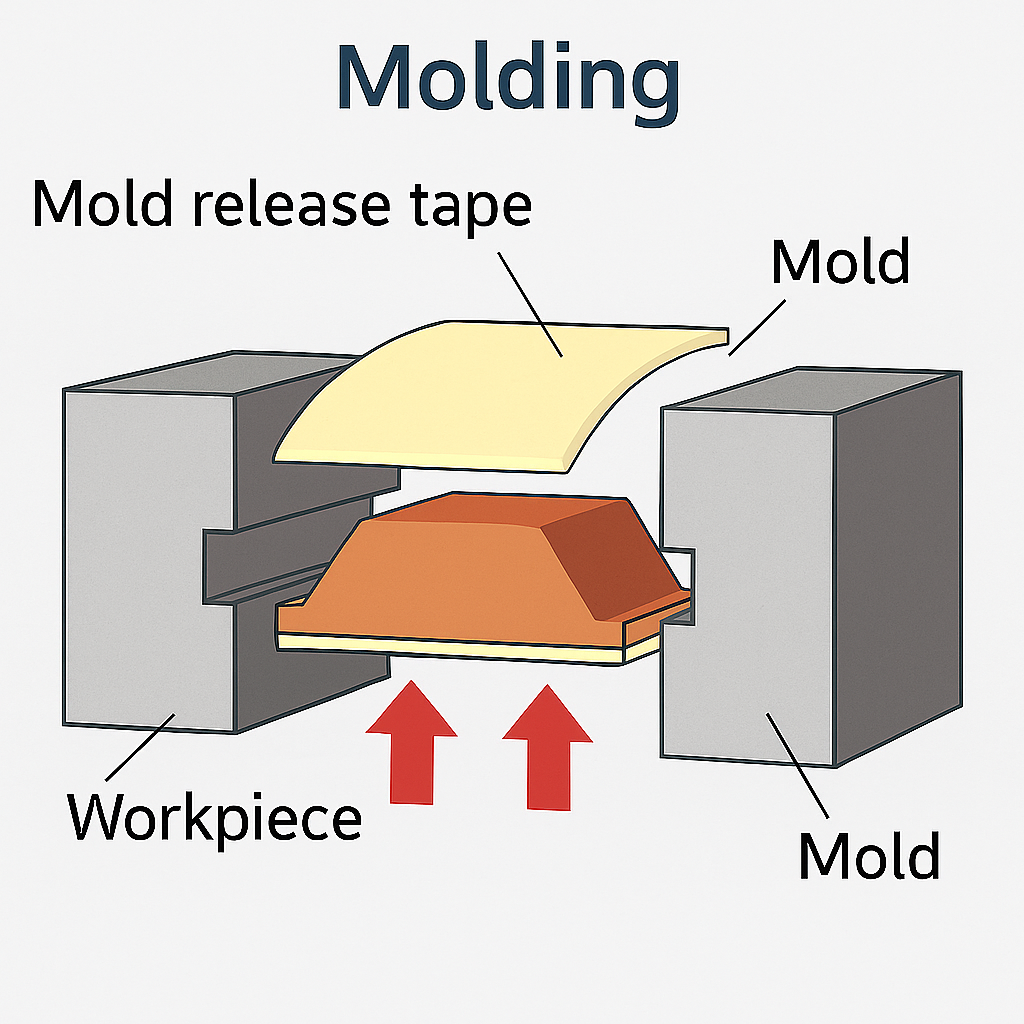 位於工件與模具之間,用以暫時固定工件並防止工件與模具直接接觸,加熱後膠帶會失去黏性,能快速剝離。